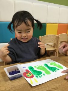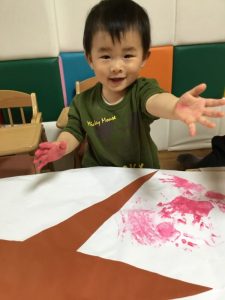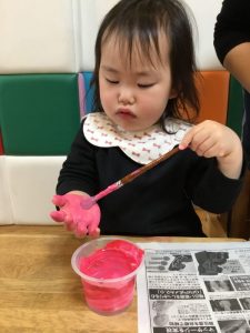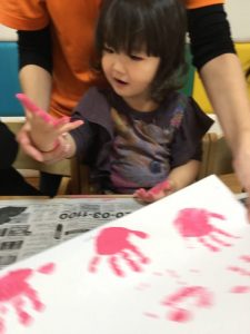 手に絵の具をつけるために筆で手をさわるとくすぐったいみたいで