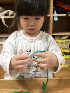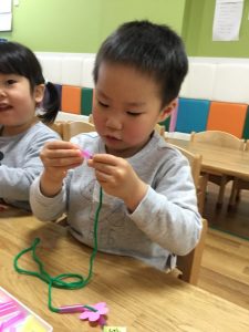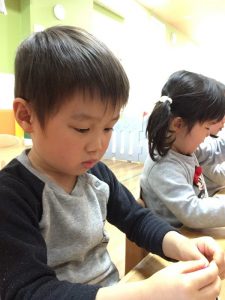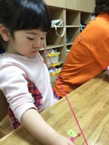 やってみるとみんな真剣な顔でひもに通していましたよ