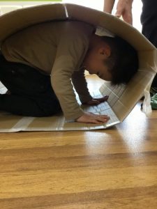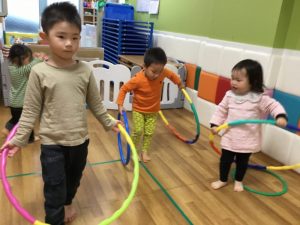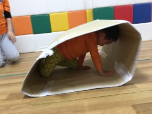今週は段ボールでつくったキャタピラーやフラフープで