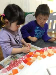 上手に色分けをして折り紙をペタペタ![]()