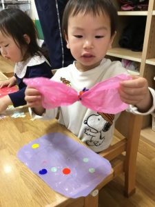 上手に色分けをして折り紙をペタペタ![]()