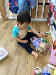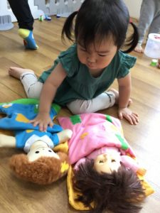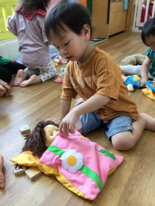 お人形をお布団に寝かせてあげてトントンしてあげたり、ミルクを飲ませてあげたり