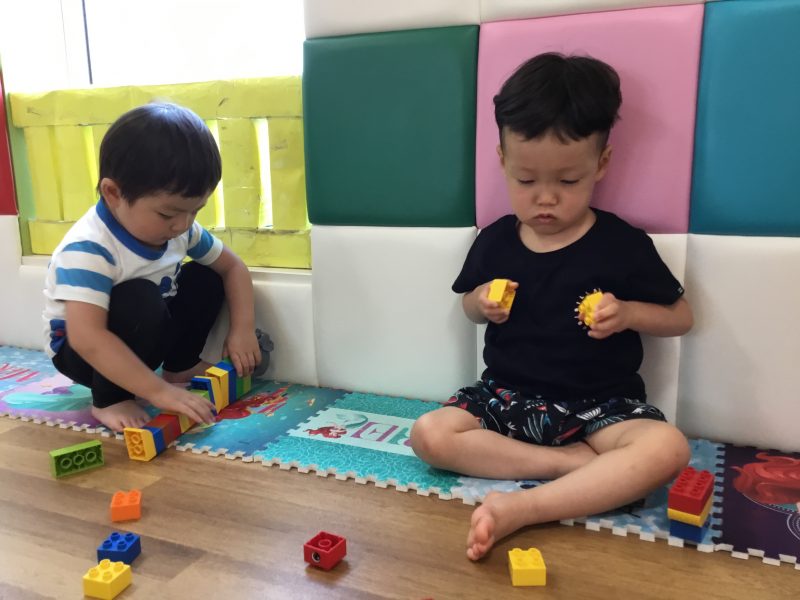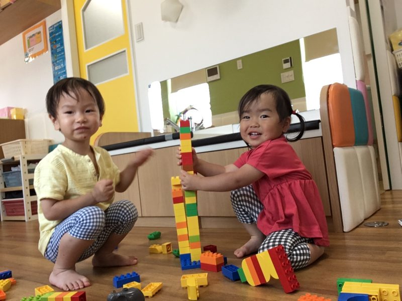 りかちゃん人形やブロックで一緒に仲良く遊んでいますよ