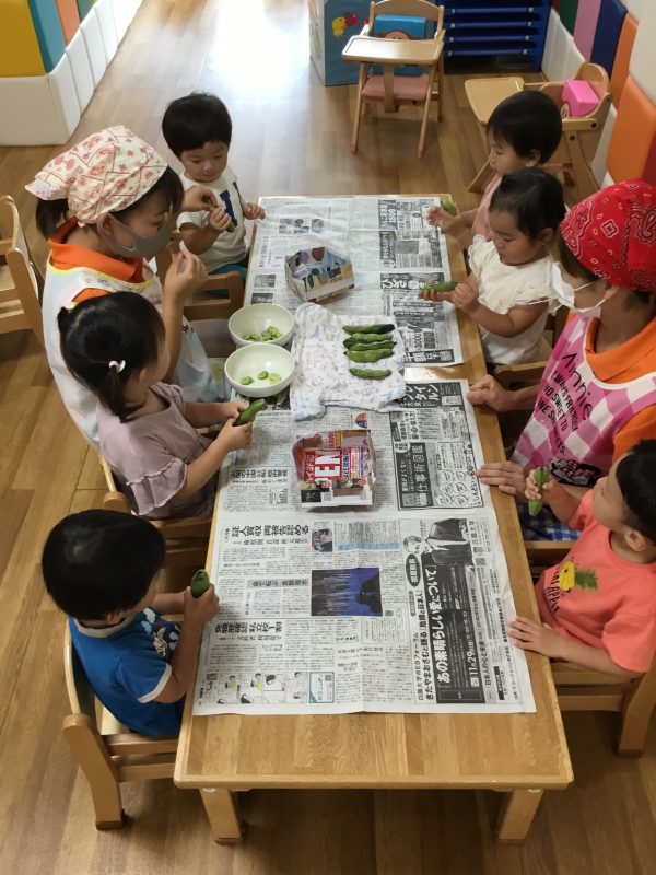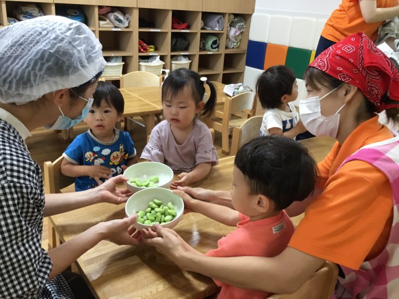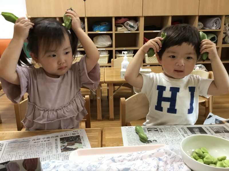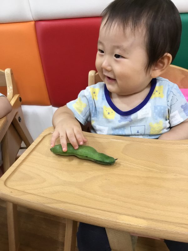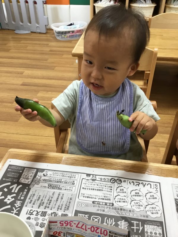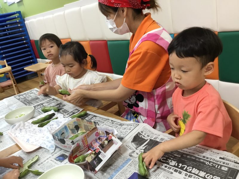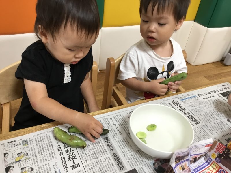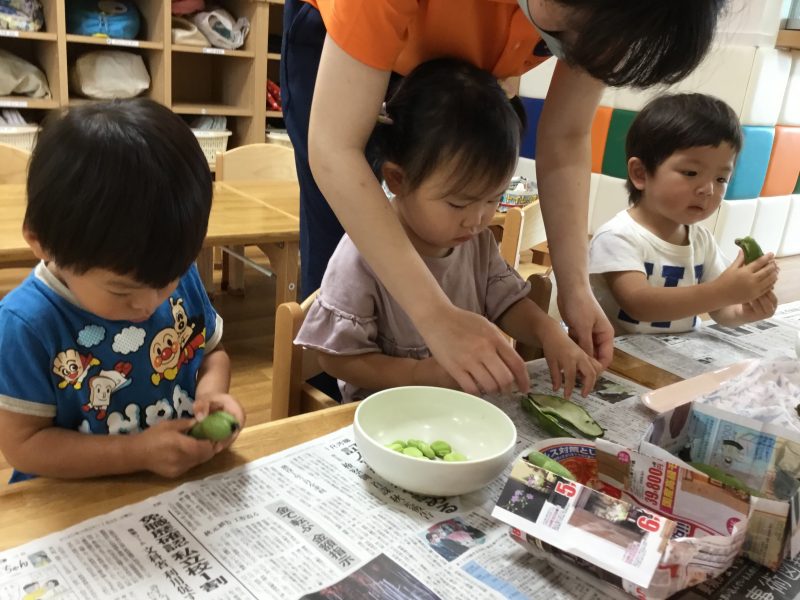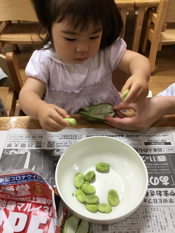 子ども達も一生懸命皮をむいてお豆が出てくるとニッコリ笑って