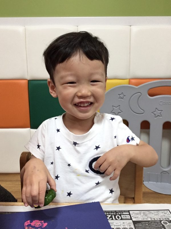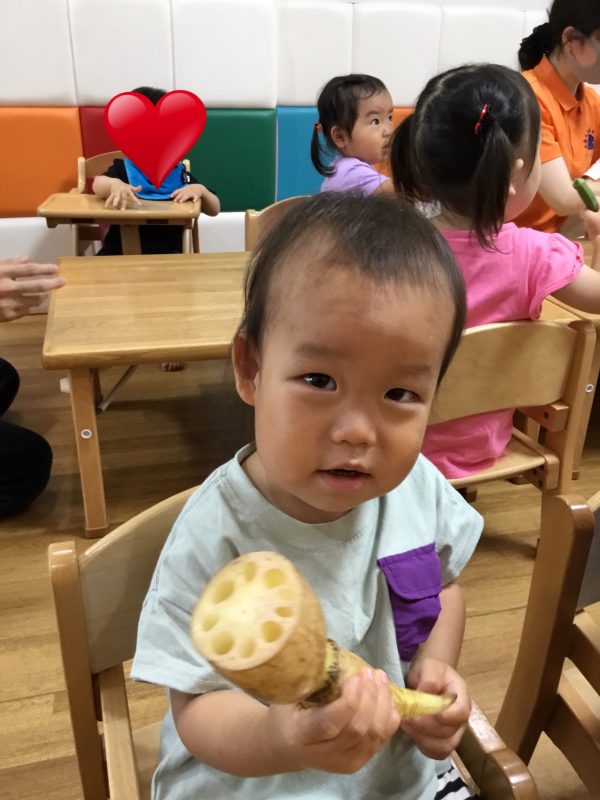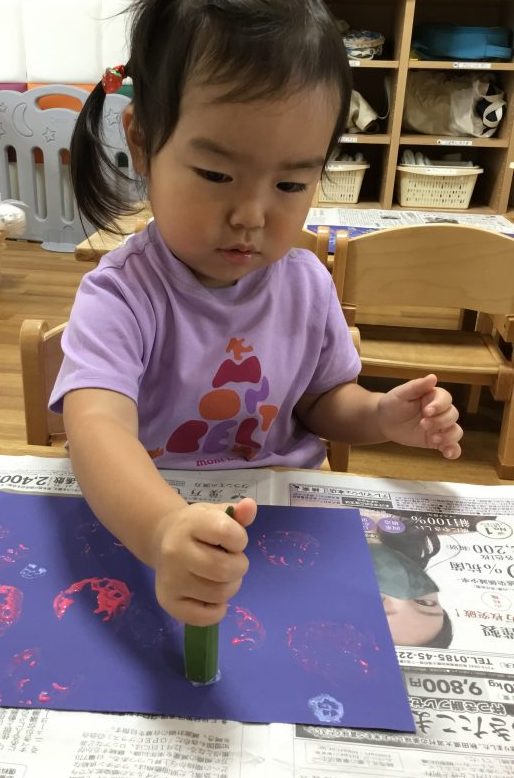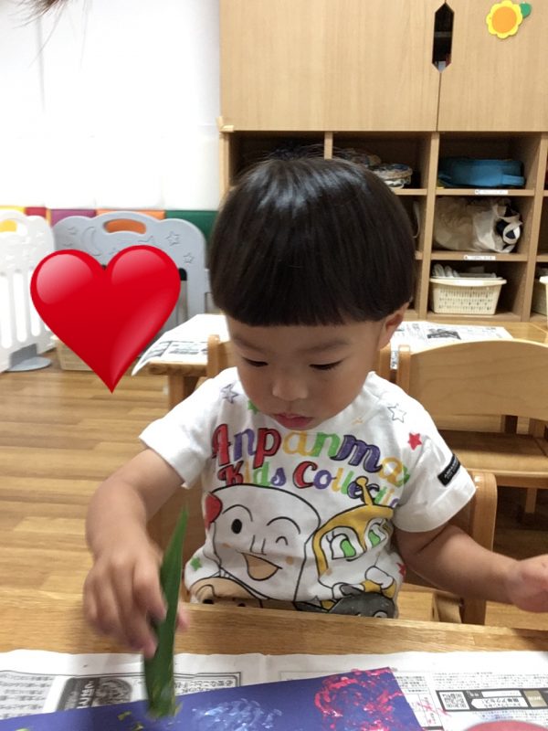 当日給食で使うきゅうりのヘタをくれて、楽しくスタンプをしました![]()