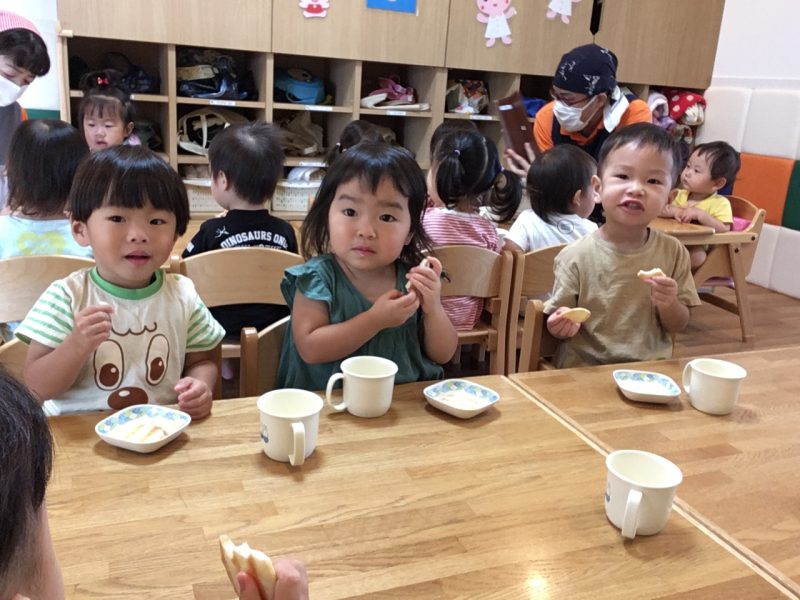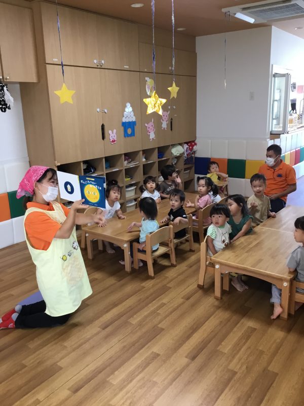お月様の絵本を読んだら、みんなでまん丸のおせんべいを食べました![]()
