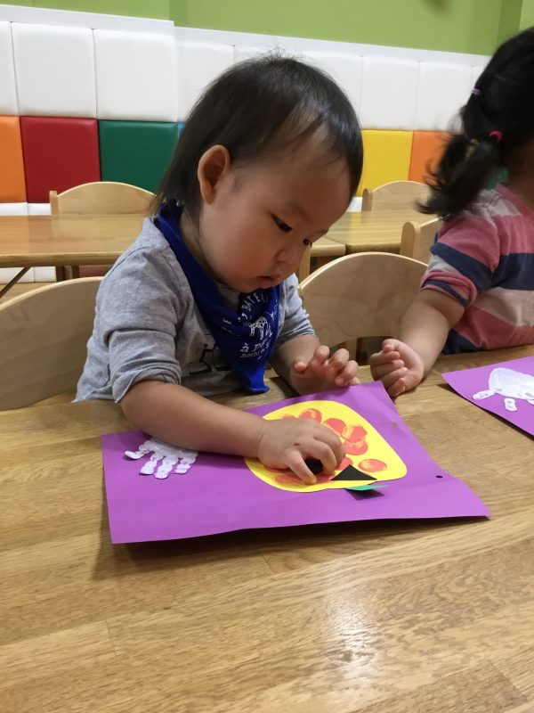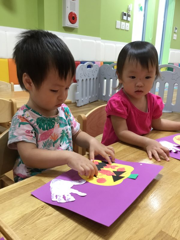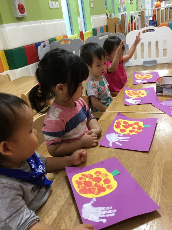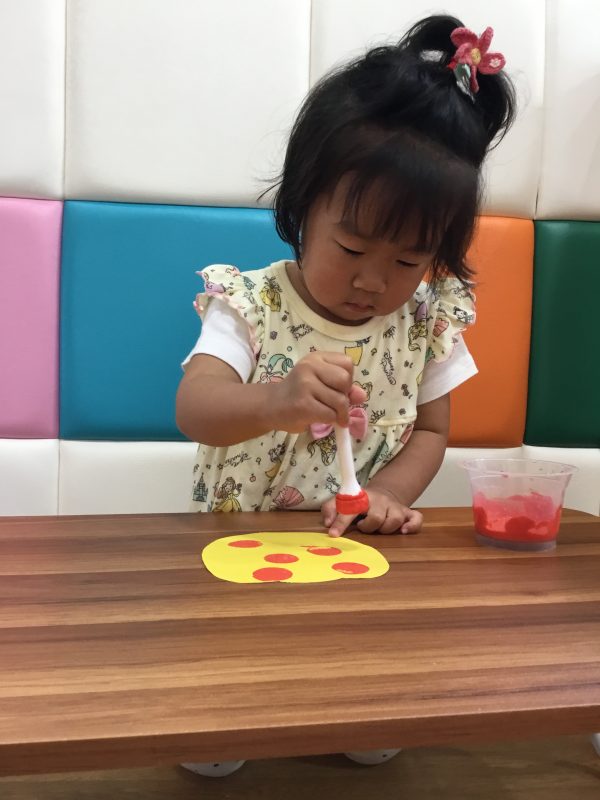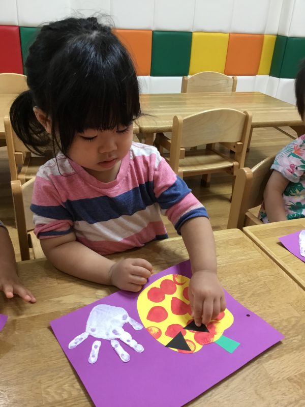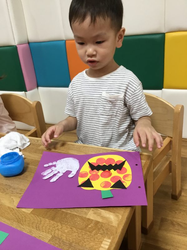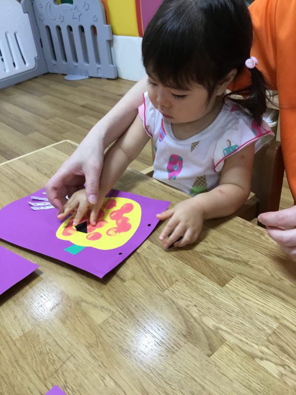 かぼちゃの形の画用紙にタンポでポンポン、不思議な〇が出来て