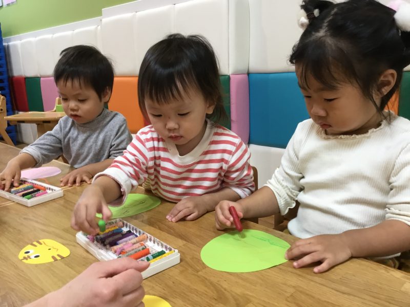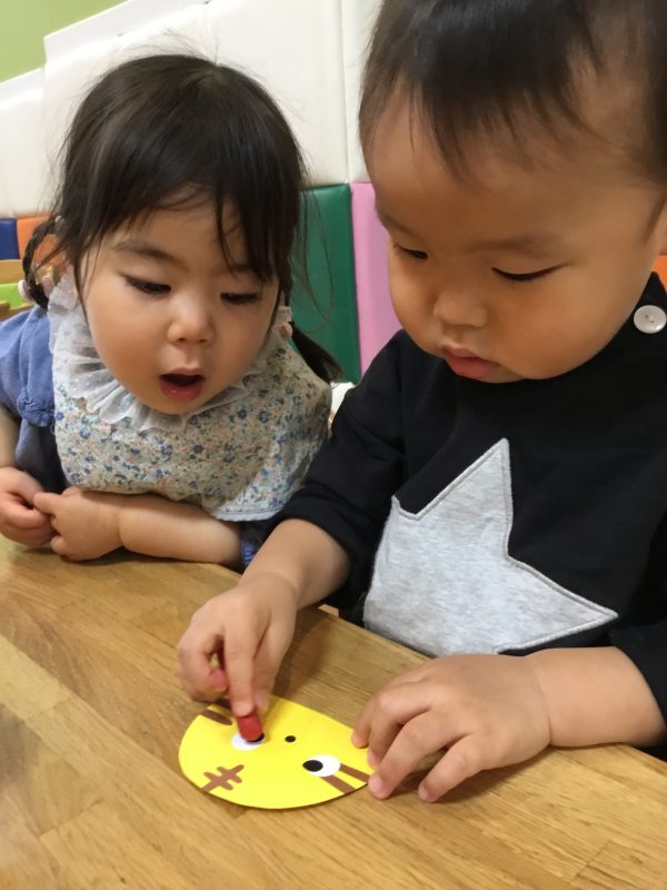 トラさんの顔に口を描いたり、好きな色のクレヨンを選んでぬりぬり