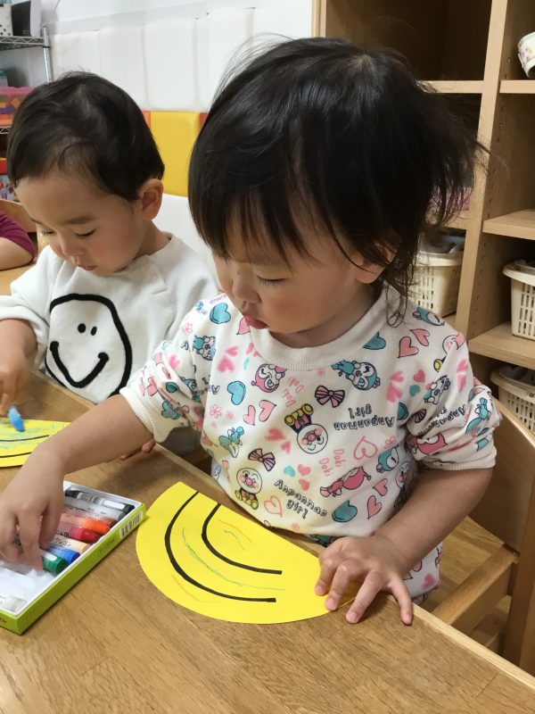 黄色い画用紙に、みんなでクレヨンでお絵描きをして、とってもカラフルな