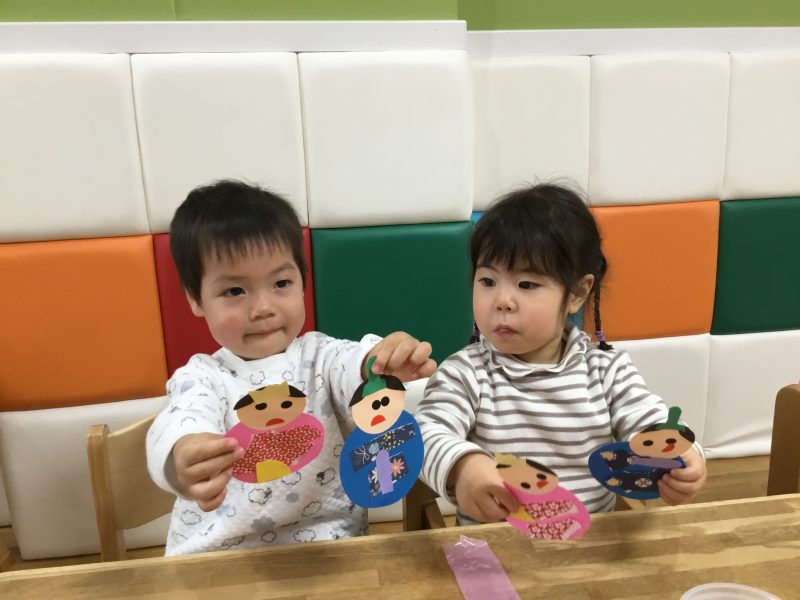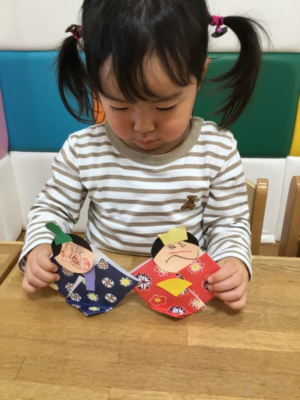 いちご組さんはお雛様とお内裏様の体に折り紙で貼り絵をしました。