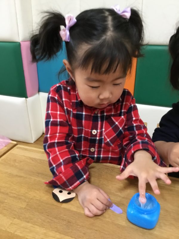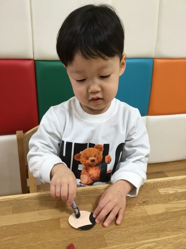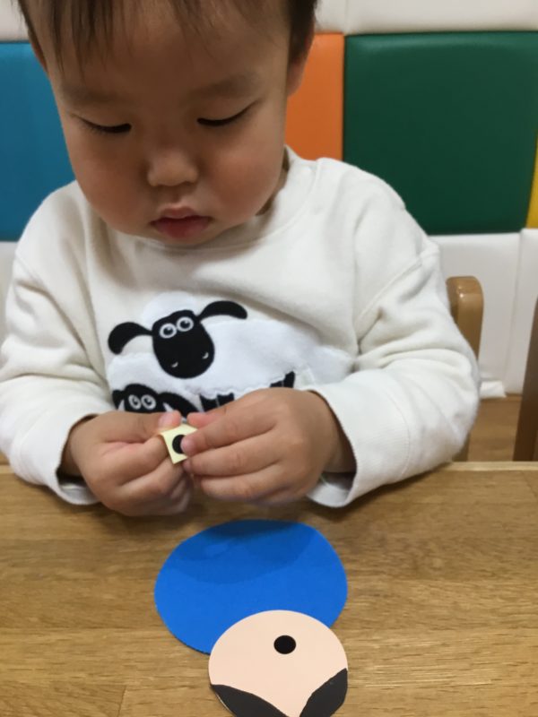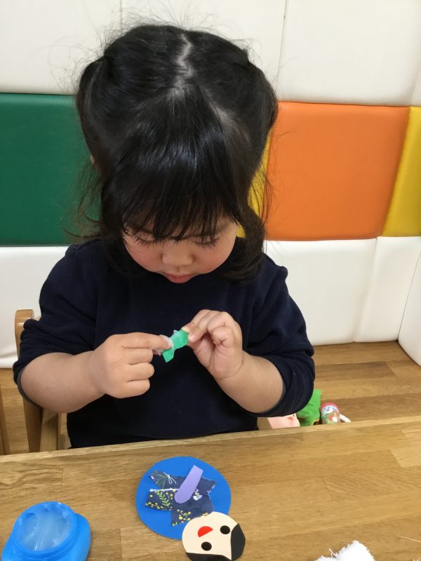 指先を器用に使って上手にビリビリ…切った折り紙に指の先に糊をつけて「どこに貼ろうかなぁ?」「ここにしよう。」と悩む姿もとても可愛らしかったですこの1年で細かい制作もとても上手にできるようになりました