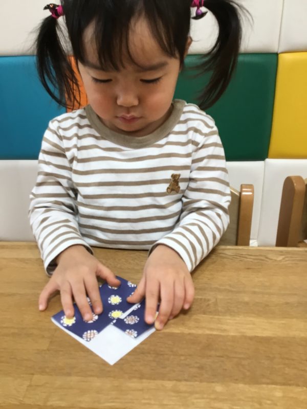 先生がお手本で折ってくれたのを見て…「ここまで折るの」「見て!できたよ」と