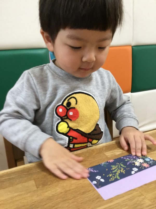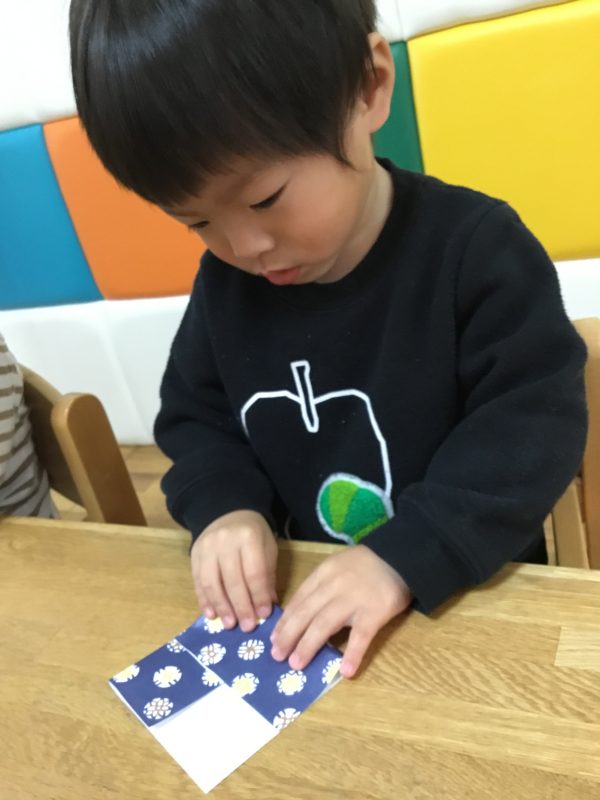 嬉しそうに見せてくれました。折り線をつける時には「アイロンだよ」と指を使って