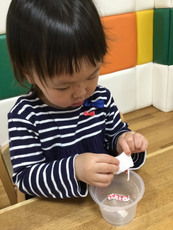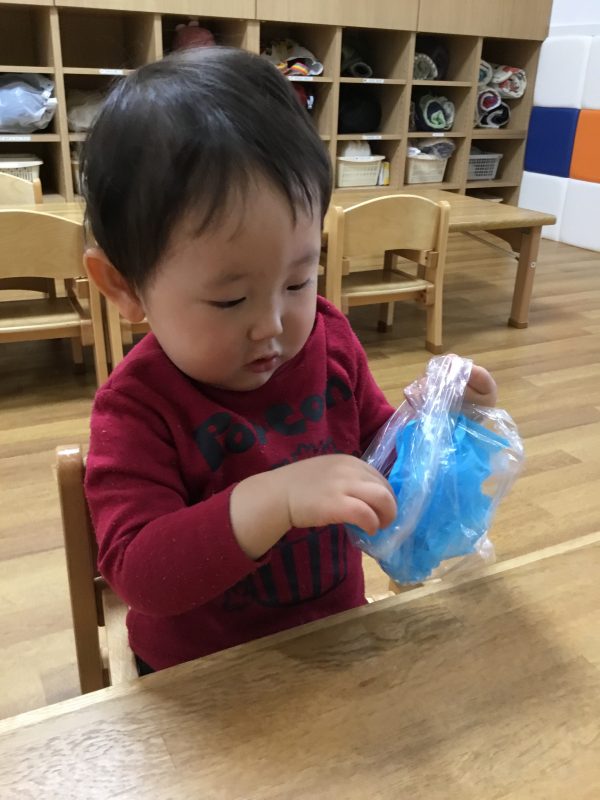 もも組さんはビニール袋の中に花紙を入れてお雛様とお内裏様を作りました。花紙をもらうと上手に手で丸めてお花紙をたくさん入れてくれました。