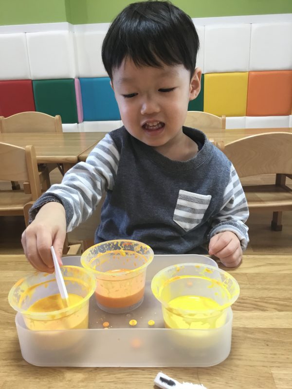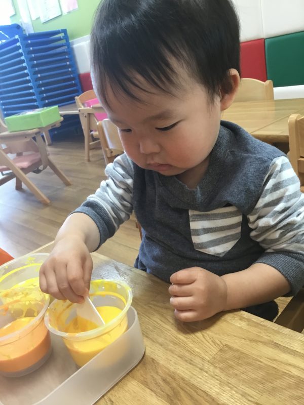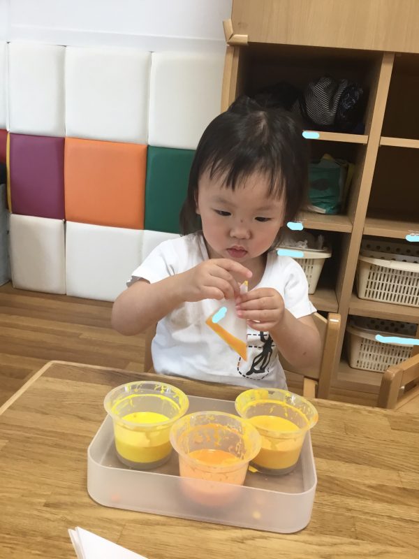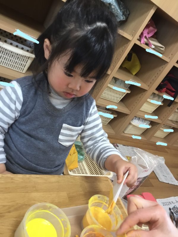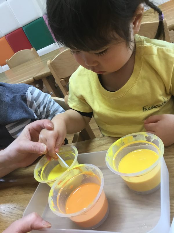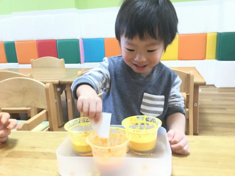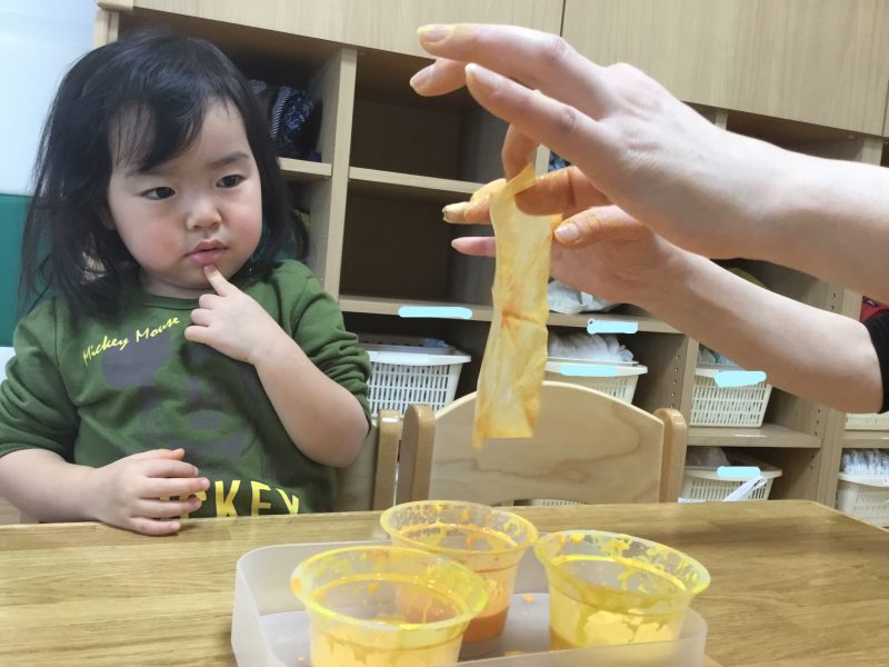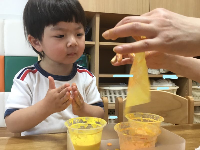 三角に折った障子紙をきいろやオレンジの絵の具の中へチャポン、チャポン!