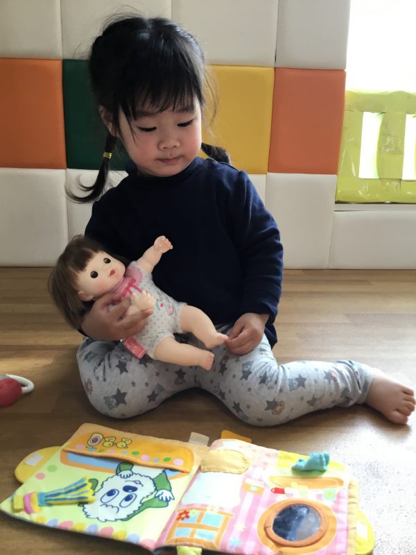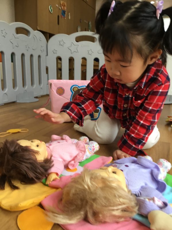 あかちゃんのお人形をお世話している姿は、見ていてほっこりしますね