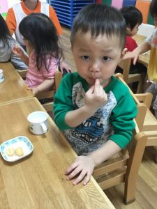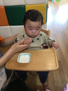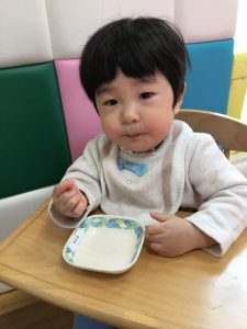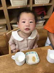はじめての保育園でのおやつ、美味しそうに食べていましたよ![]()