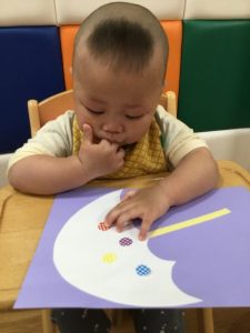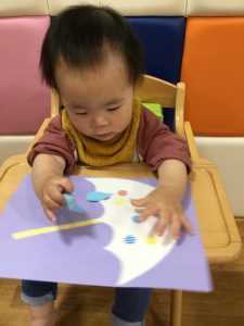 手についたシールを不思議そうに見たり、触ったり、先生と一緒にペタペタ貼って楽しみました![]()