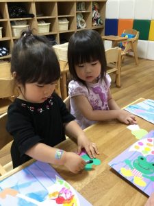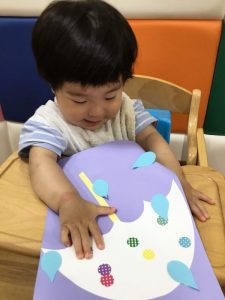手についたシールを不思議そうに見たり、触ったり、先生と一緒にペタペタ貼って楽しみました![]()