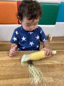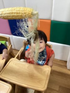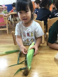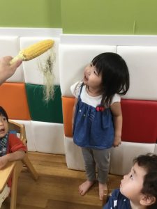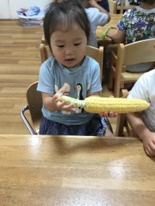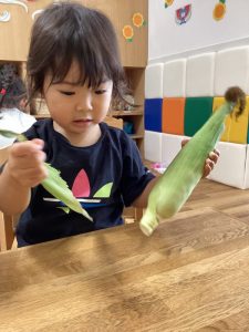 みんなで本物のとうもろこしをむきました