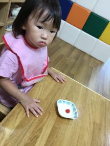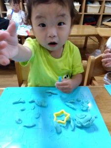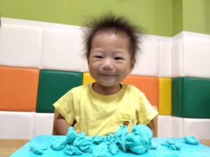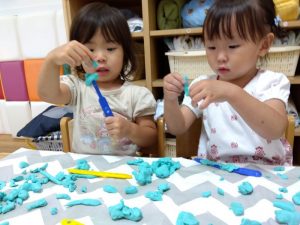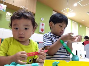 室内で1.2歳児さんは粘土遊びをしました![]()
