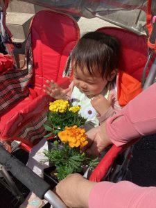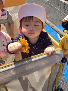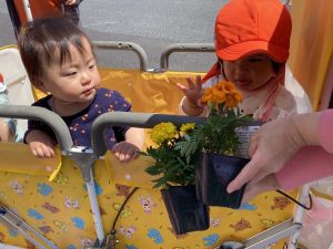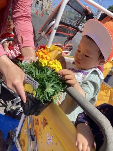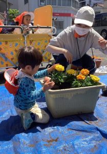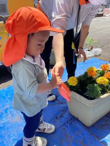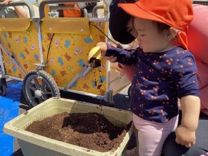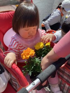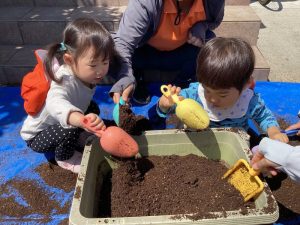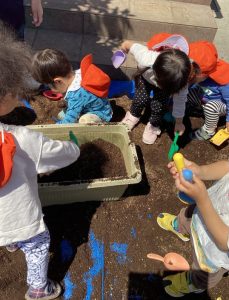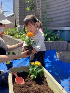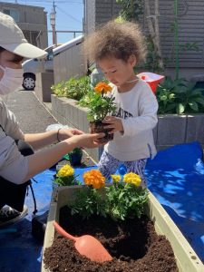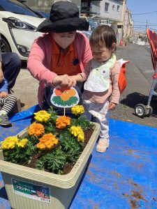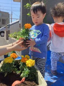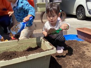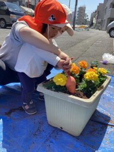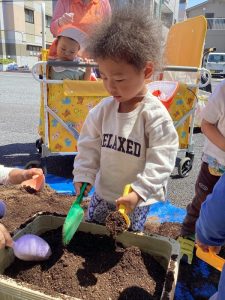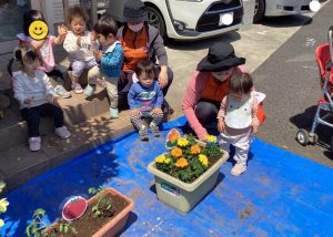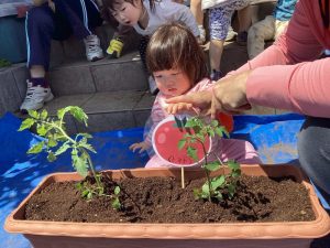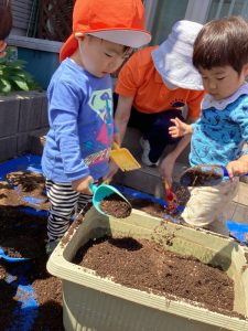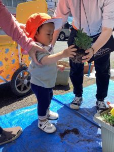 空っぽの植木鉢にみんなで新しいお花やお野菜を植えました!