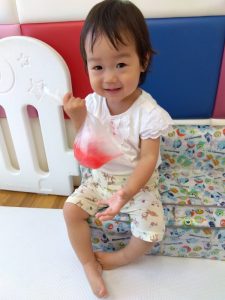 お部屋の中でも色水に触れています![]()