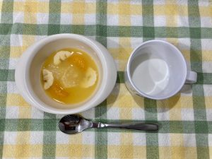 今日のおやつは、フルーツポンチでした。入っている果物の名前当てクイズをしながら、楽しそうにおやつを食べていました!