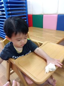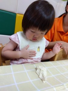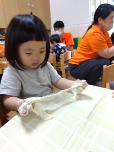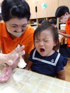 慣れない感触に思わず手を拭いてしまう子…