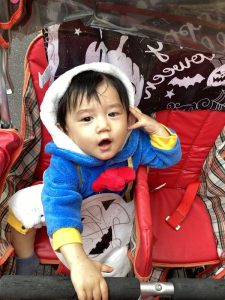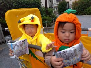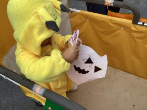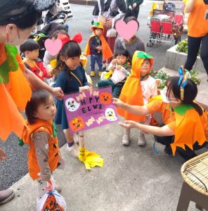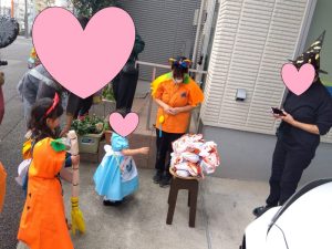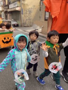 元気に「トリックオアトリート!」、ご家族や先生たちからお菓子を貰ってにっこりしていました
