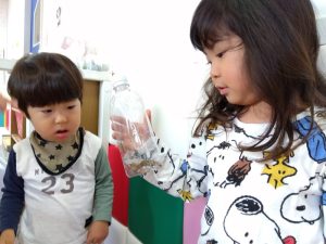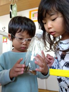 たくさん観察した後はお外のお花の上にそっと返してさよならをした子どもたちです。