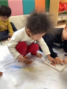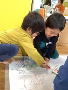 みんなが乗れるほど大きな紙にお絵かきでは