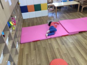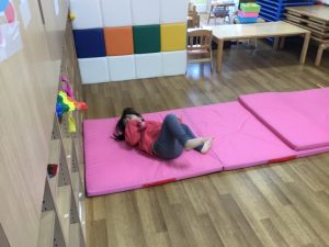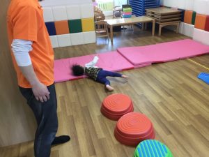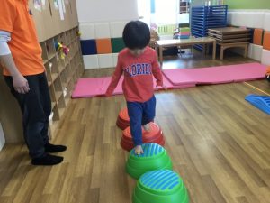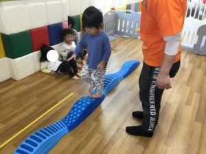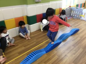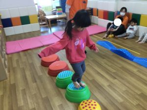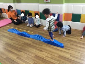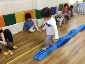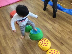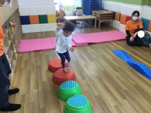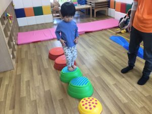お部屋の中に平均台、マット、飛び石のサーキットを用意しました!