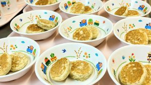 (写真は後期食です。月齢によって形、固さ、盛り付け量を変えて提供しています。)