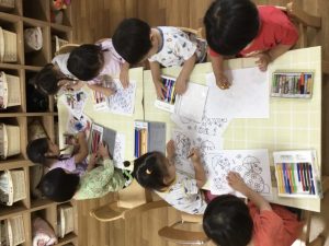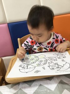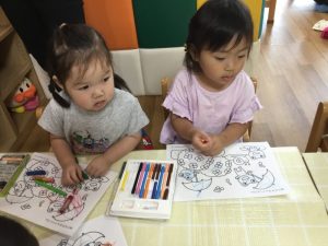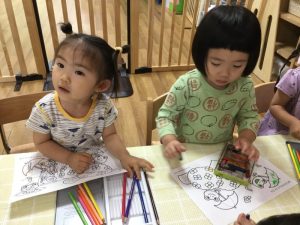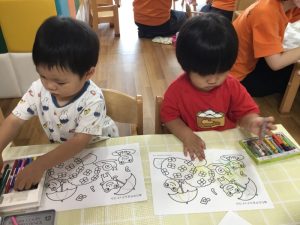 梅雨入りも近くなってきたので、みんなでカエルと紫陽花の塗り絵をしました。