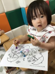 色鉛筆やクーピーを使って「どの色にしようかなぁ?」「ママと紫陽花見たよ」と