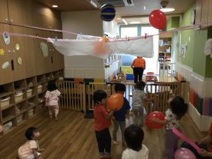 「えい‼︎」と力いっぱい飛ばしてみても、風船はフワフワしていてなかなか思うように