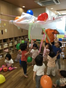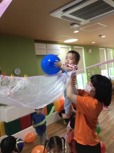 たくさん乗った風船は長い風船を使ってみんなで協力して落としました。