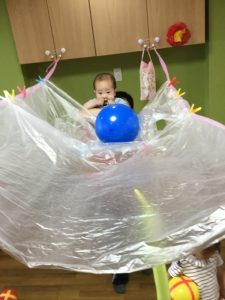 ビニール袋を買ってハンモックのように吊るしその上に風船を乗せて見ました。