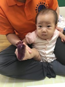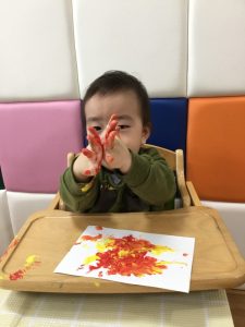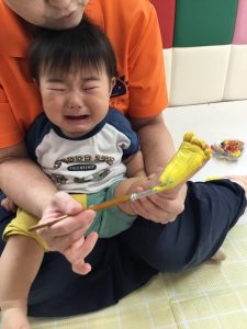 みんなの小さな手や足に絵の具をつけてペタッとスタンプしました。筆で絵の具を付けると