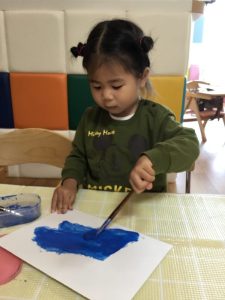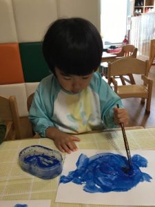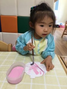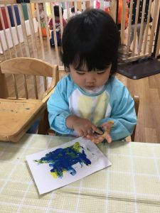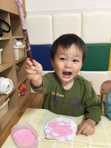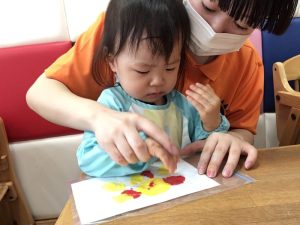 いちご組のお友だちは絵の具の感触を楽しむ制作をしました。