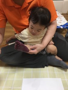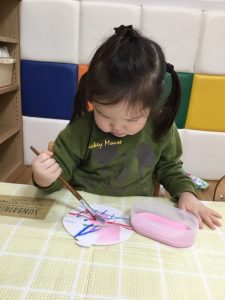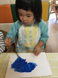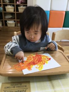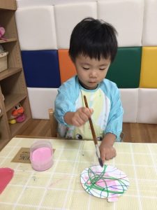 シールを貼ったり筆で色を塗ったりしました。筆を持って塗るのもとっても上手になりました。