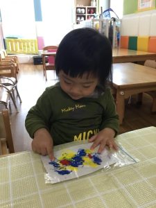 絵の具の感触が苦手な子は袋の上から触ったり、画用紙からはみ出して塗る子など