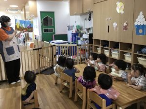 ナスのお話もしていました。保育園の裏口のナスもみんなに負けずスクスクと育っていますよ。