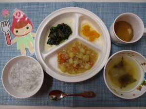 (写真は離乳食後期です。年齢によって形、固さ、盛り付け量を変えて、提供しています。)