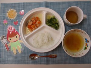 (写真は後期食です。離乳食は、離乳食の段階ごと固さ、切り方、量を変えて提供しています。)