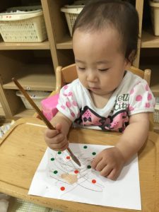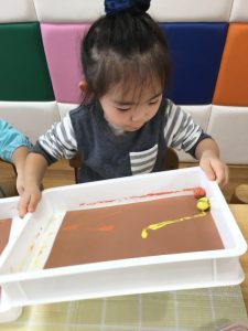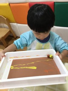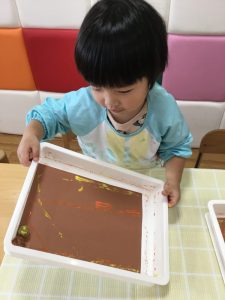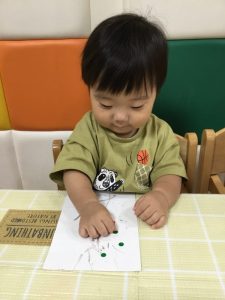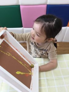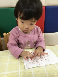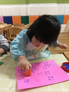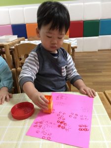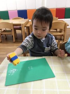 「ブロックに絵の具つけて良いのかなぁ?」と話し声が聞こえてきたので「絵の具つけて画用紙にスタンプして良いよ」と声をかけると楽しそうにたくさんスタンプしていました