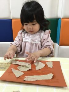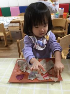 ちぎった紙はいろいろな形があってどれを貼ろうか迷っちゃう…どれにしようかなぁ。