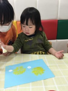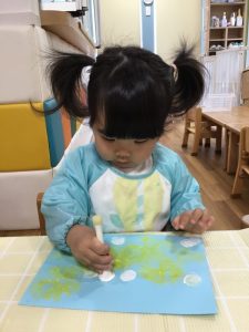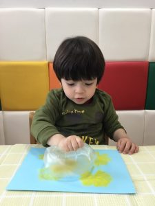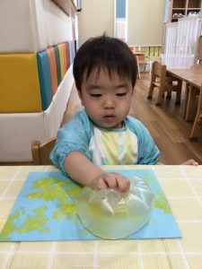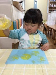 ビニール袋に空気を入れてくくり、しわしわになったところに色をつけポンポンとスタンプしました!