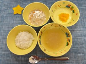 (写真は後期食です。月齢によって形、固さ、盛り付け量を変えて提供しています。)